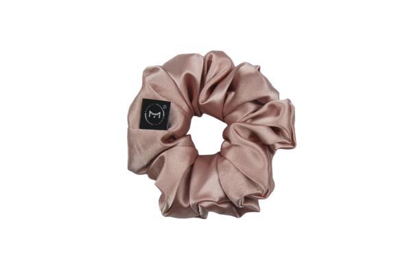 Scrunchie de cetim bege no tamanho CLÁSSICO.
