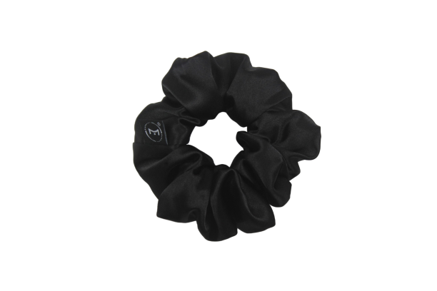Scrunchie de cetim preto no tamanho CLÁSSICO.