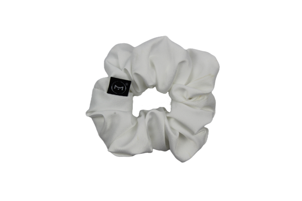 Scrunchie de cetim branco no tamanho CLÁSSICO.