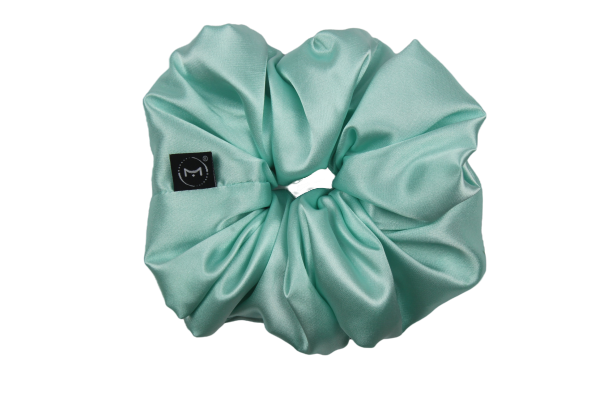 Scrunchie de cetim verde água no tamanho MAXI.