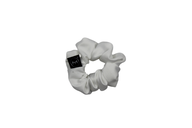 Scrunchie de cetim branco no tamanho PEQUENO.
